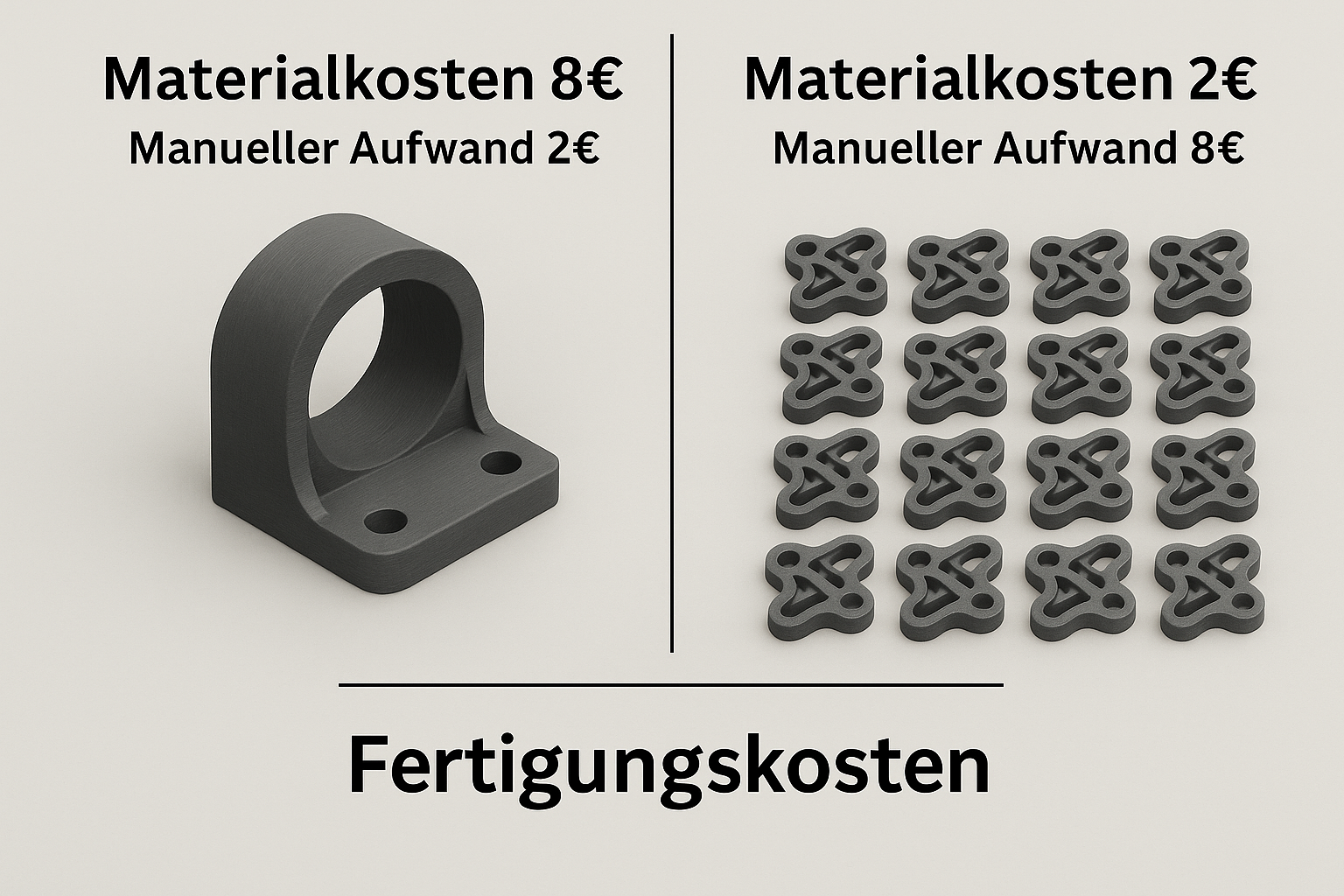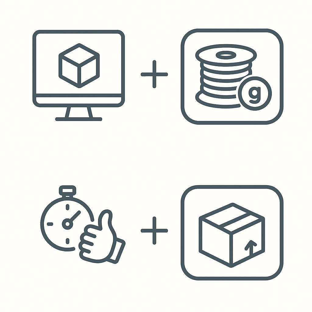 Die Fertigungskosten entstehen durch den individuellen Aufwand bei der Einrichtung des Druckvorgangs, der Nachbearbeitung (z. B. Entfernen von Stützstrukturen, Glätten, Reinigen) sowie der manuellen Handhabung der Teile. Dieser Aufwand hängt stark von der Teilgröße, der Geometrie, der Komplexität und der Stückzahl ab und wird entsprechend angepasst kalkuliert.